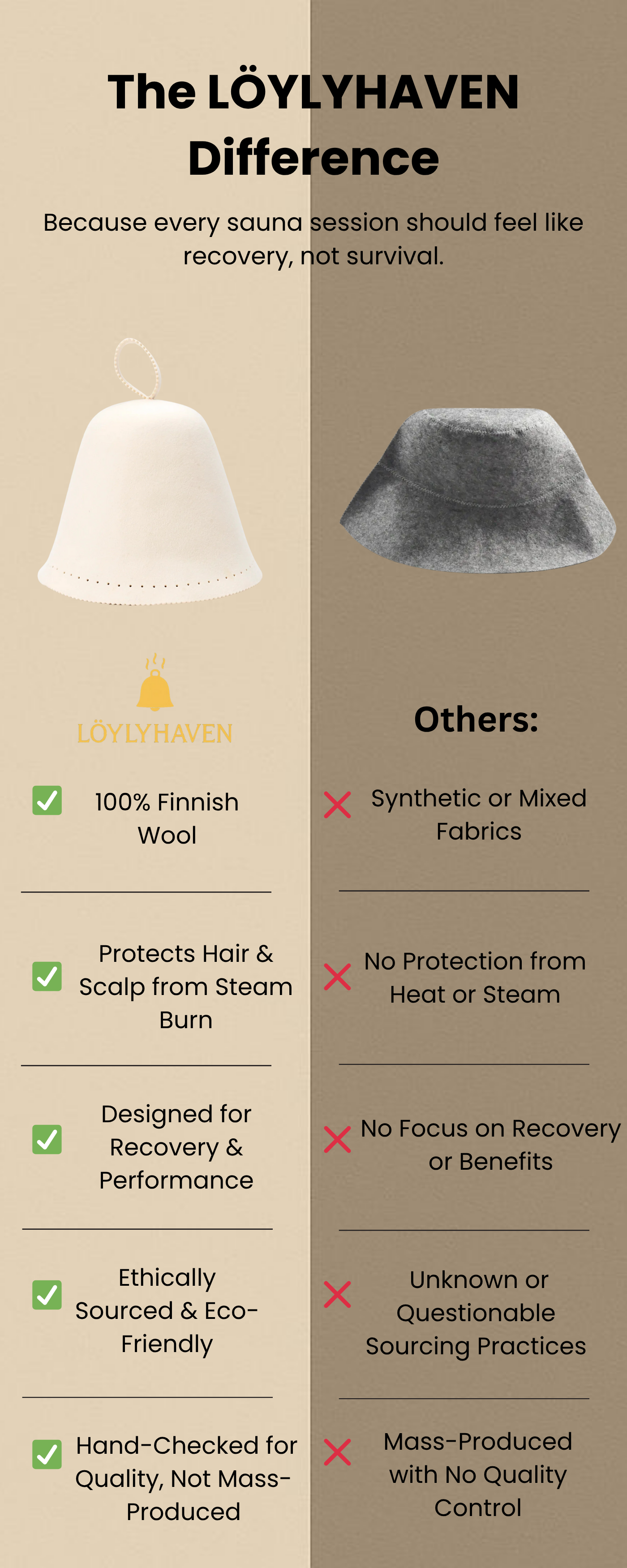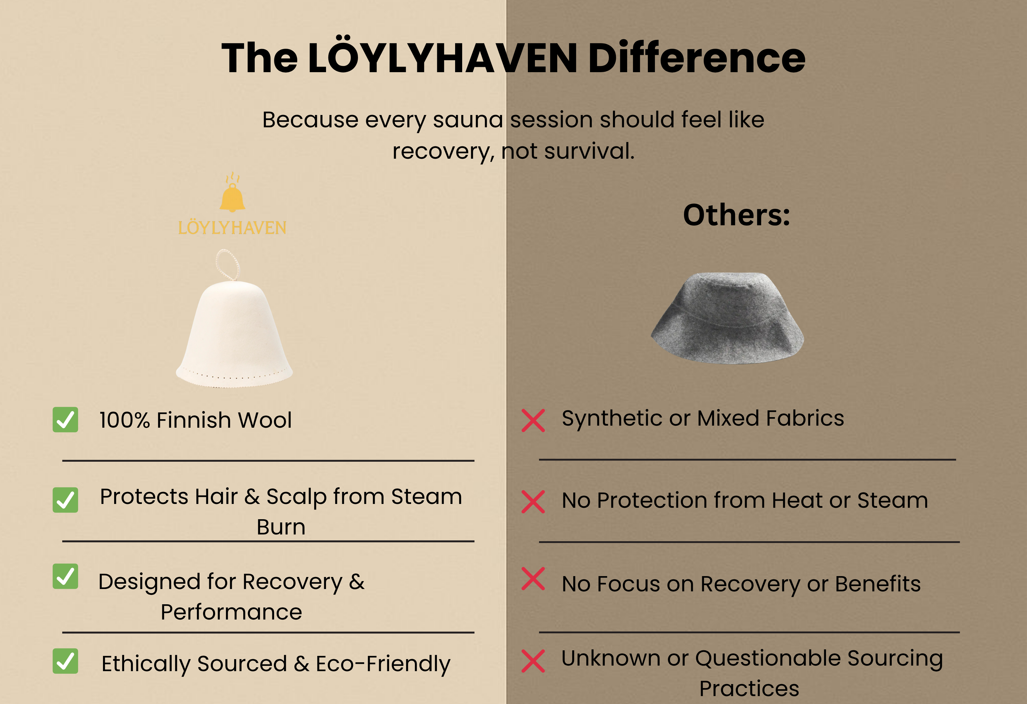 At LÖYLYHAVEN, we take sauna culture seriously — just not ourselves. Our 100% Finnish wool hats are crafted to protect your head, your hair, and your pride when the steam hits like a deadlift PR.