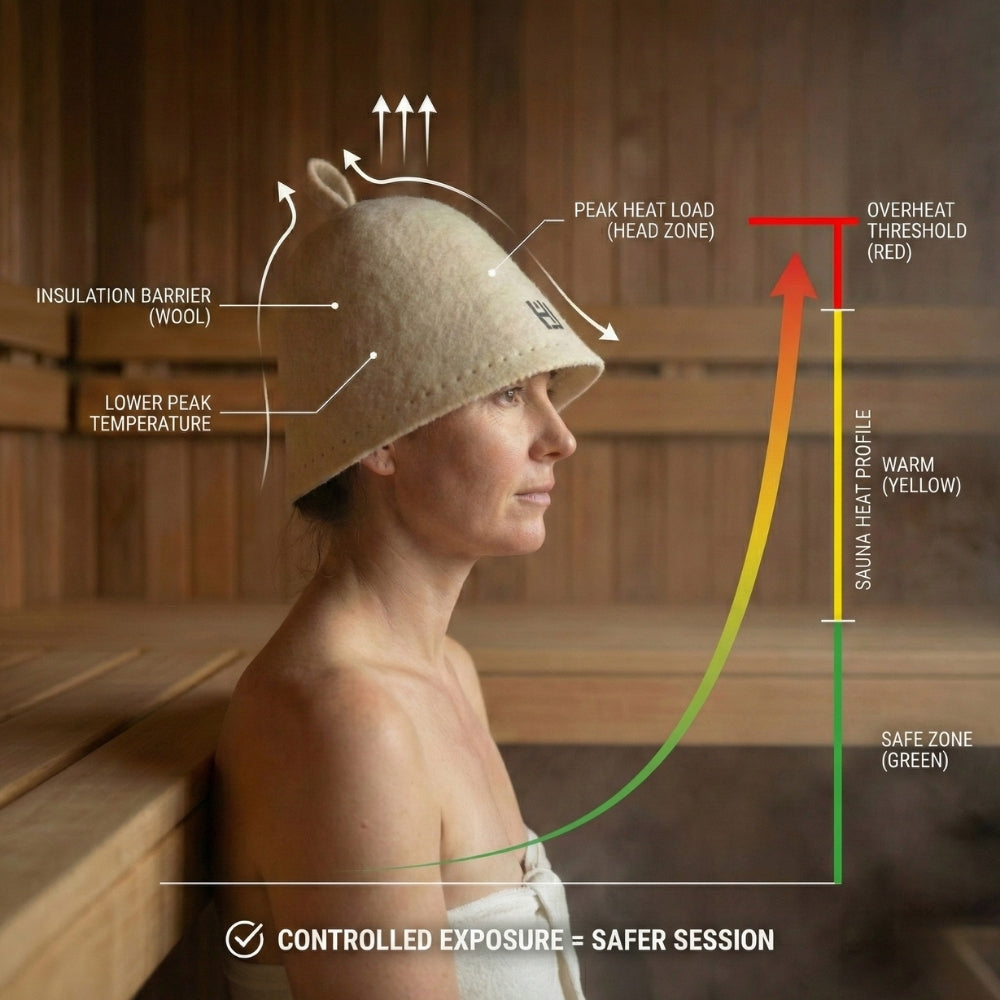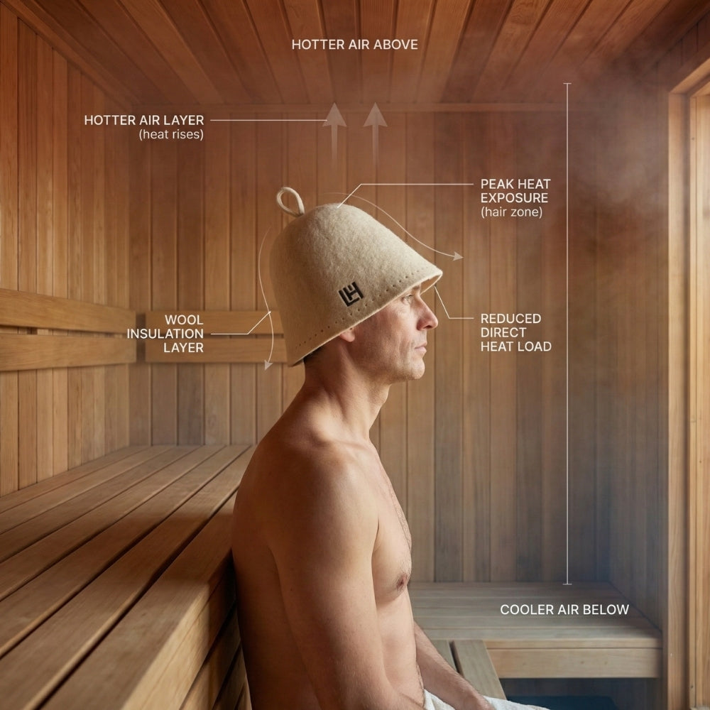 Hot air rises. The top of the sauna is the harshest zone. Our sauna hat creates a buffer between that peak heat and your head, reducing the spike that forces you out early. You stay composed, and leave on your terms.
